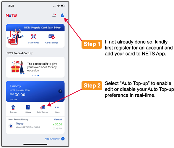 For existing users (after the first top-up), the NETS vCashCard account will be topped up automatically via the credit/debit card that was used to register for the NETS vCashCard whenever the amount on your NETS vCashCard account falls below threshold amount. This top-up amount will appear in your account statement. Alternatively, you may perform ad-hoc top-up to your vCashCard account. The amount for each top-up is pre-set at $50.